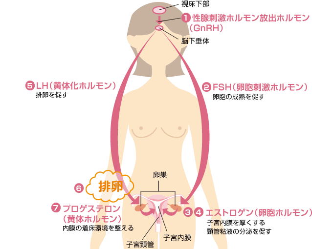 まず最初に大脳視床下部から 性腺刺激ホルモン放出ホルモン(GnRH)が放出され、これが脳下垂体の卵胞刺激ホルモン(FSH)と黄体形成ホルモン(LH)の放出に影響を与えます。