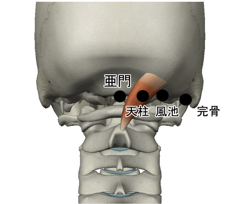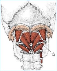後頭下筋群とは 後頭骨と第1・第2頸椎(首の骨)をつなぐ4対(計8本)の小さな筋肉の総称です。